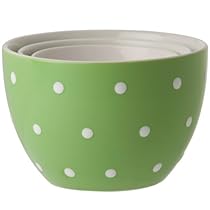 Signature Housewares Dots 3-piece Bowl Set is made from durable 100-percent lead-free stoneware. Set includes a 4-inch 5-inch and 6-inch bowl nested together and tied with a white ribbon. A sprinkling of small white dots on a Green background decorates the exterior of each bowl; the interior is a crisp white. Works great for prep and spice bowls. Coordinates with other Signature Housewares Dots items. Also available in Red Black Orange and Turquoise. All Signature Housewares dishes are microwave- oven- and dishwasher-safe and are tested to meet FDA and California Proposition 65 food safety standards.