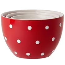 Signature Housewares Dots 3-piece Bowl Set is made from durable 100-percent lead-free stoneware. Set includes a 4-inch 5-inch and 6-inch bowl nested together and tied with a white ribbon. A sprinkling of small white dots on a red background decorates the exterior of each bowl; the interior is a crisp white. Works great for prep and spice bowls. Coordinates with other Signature Housewares Dots items. Also available in Green Black Orange and Turquoise. All Signature Housewares dishes are microwave- oven- and dishwasher-safe and are tested to meet FDA and California Proposition 65 food safety standards.